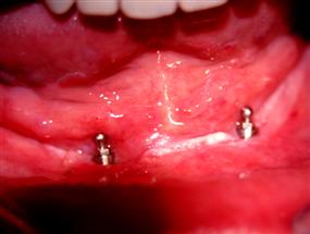 Paní , 47 let, ztratila v dolní čelisti stoličky a řezáky se z důvodu zánětu podpůrných tkání začaly pohybovat.To velmi ztížilo jak ukusování sousta, tak žvýkání. Řešení: do zadní části dolní čelisti byly zavedeny implantáty, řezáky byly vytaženy a byl zhotoven metalokeramický můstek.